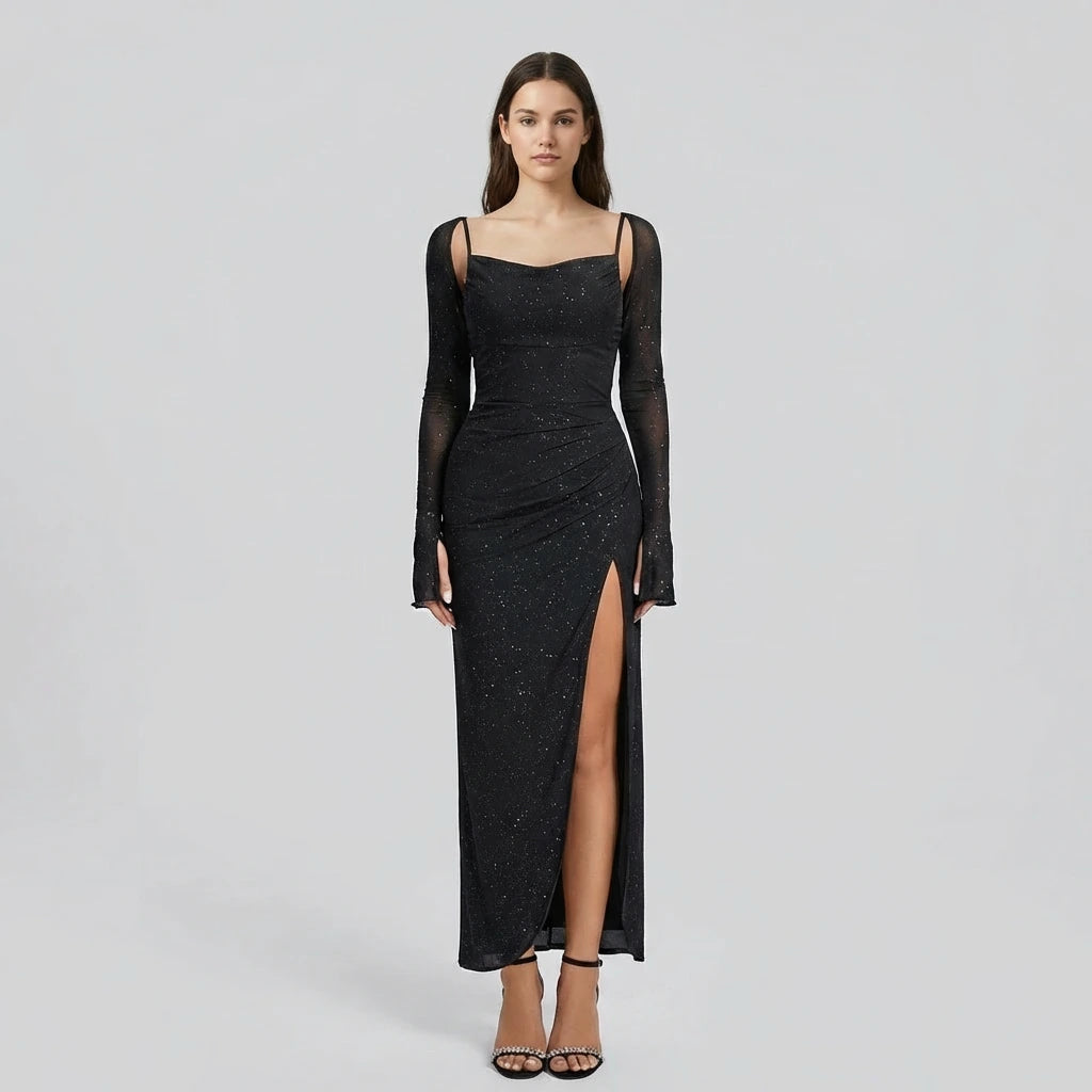 Command the room in the Isabella Glitter Halter-Neck Maxi Dress, a glamorous, figure-flattering showstopper designed for your most unforgettable nights. With a sleek halter neckline, a striking open back, and a daring high slit, this maxi dress blends elegance with irresistible allure. The shimmering mesh catches the light with every step, while the high-stretch fabric and soft lining keep you comfortable and confident from first toast to final dance.